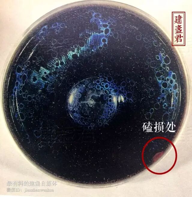 ▼日方称为“准曜变”的宋代建盏口沿特写,干口程度较轻,要靠近方能看清。